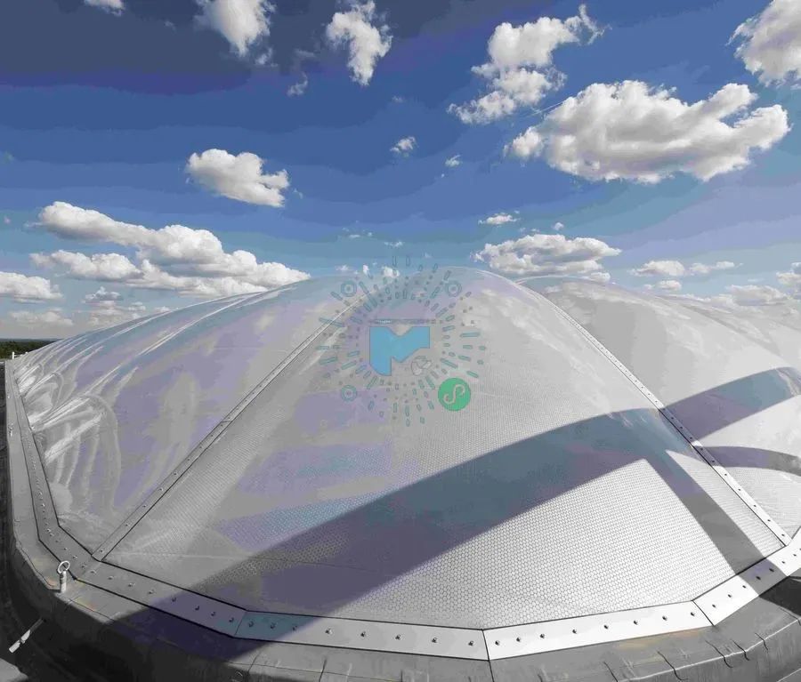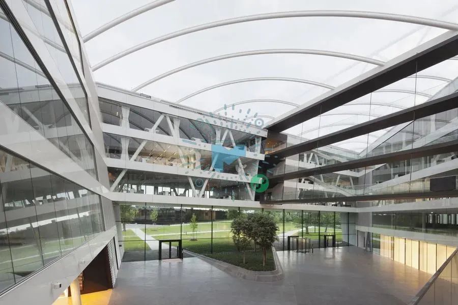 这个内部空间是该建筑的交流中心。建筑中庭的屋顶。由五个气枕区共82个气枕建成,并结合在一起,完成了ETFE气枕的屋顶。技术亮点是每个气枕都有其独立的几何形状,由支持性的钢拱门和边缘的桁架来固定。